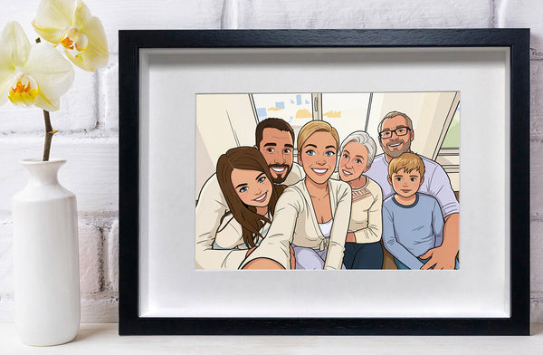Your cartoon style print will then be presented in a mount and choice of black or white frame. The print is recessed to the back of the frame to add that authentic arty feel.